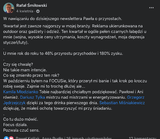 „Najlepsza rzecz jaka mogła mnie spotkać. Faktycznie wiem co robić i jest ogromna motywacja do rozwoju firmy. Po ochłonięciu emocji widać, że FOCUS jest przemyślaną i dobrze zrealizowaną wielowymiarową przygodą, która się dopiero rozpoczęła."