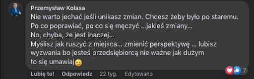 „Przyznam szczerze, że na początku miałem delikatne wątpliwości co do zaproponowanej formuły warsztatów, jednak z biegiem czasu stwierdziłem, że to właśnie ta formuła stanowi największą ich wartość. To, że mogliśmy w ramach podgrup wzajemnie poopowiadać o różnych obszarach funkcjonowania naszych firm oraz ich problemach było bardzo otwierające i inspirujące jednocześnie. To autentycznie zmieniło moją optykę postrzegania pewnych ważnych kwestii i jestem za to organizatorom warsztatów bardzo wdzięczny.”