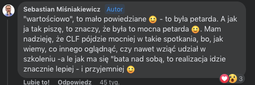 „Strzał w dziesiątkę - dokładnie tego potrzebowałam :-) Warsztaty były bardzo wartościowe i inspirujące. Wyszłam z nich z konkretami, chociaż przed warsztatami ciężko mi było sobie wyobrazić, jak to zrobicie, że każdy wyjdzie z warsztatów z gotowym planem działania. Zdecydowanie dodatkową wartością było poznanie teamu CLF na żywo oraz dyskusje z innymi przedsiębiorcami.”